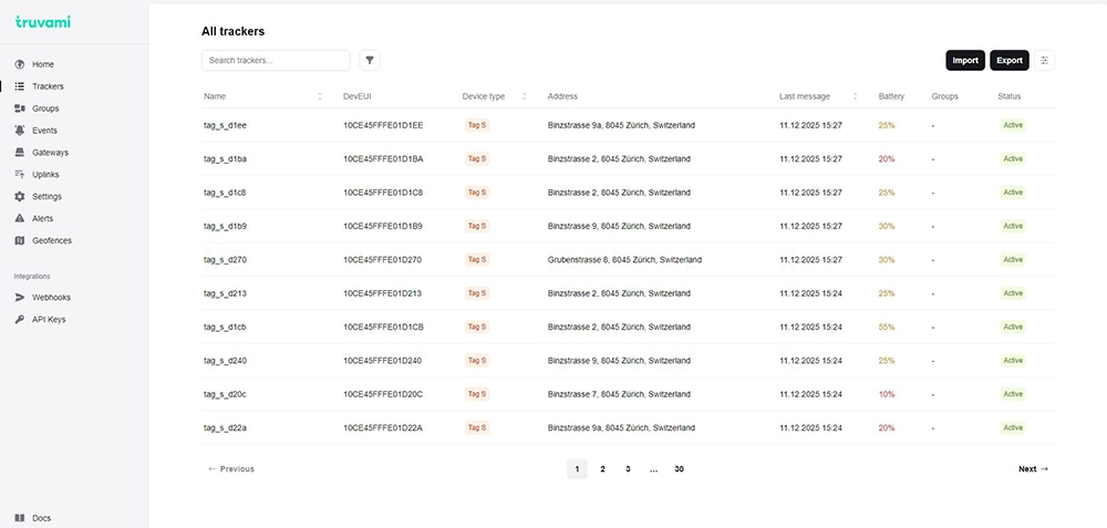 The Trackers page provides a complete overview of all devices associated with the organization.